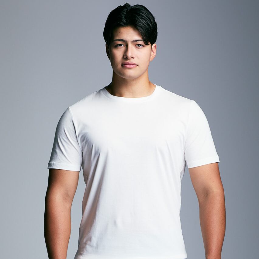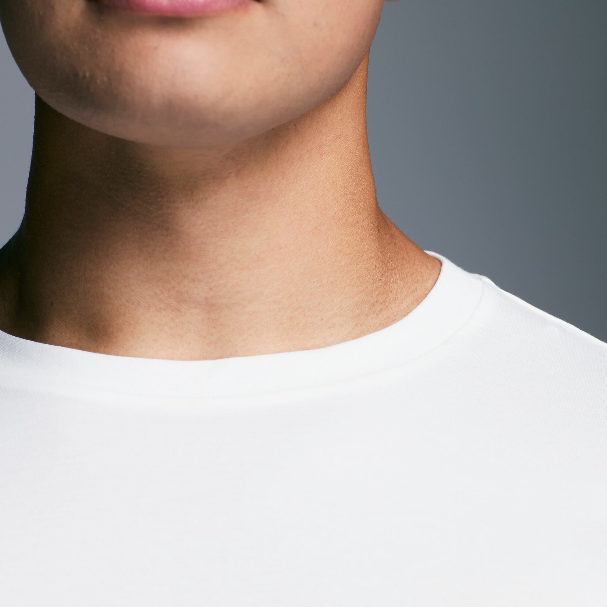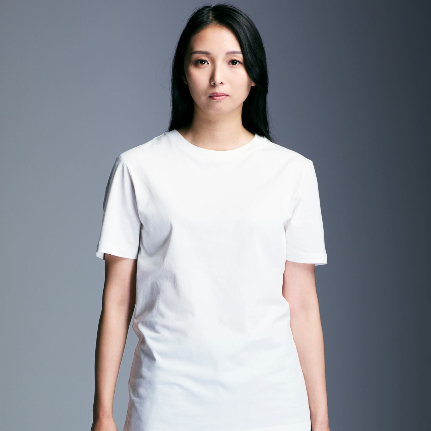 ・超長綿の原料を72/2という番手に仕上げながら強撚タッチに撚糸を行いガス焼き工程を通すことで、極限まで毛羽をそぎ落としクリアな表面感が特徴の素材を使用しており、 従来のカットソー素材と比べ毛羽立ちが少なく、72/2をハイゲージに編立することにより透けにくい肉感を作り出し、綿素材では表現しにくい適度な張り感と落ち感を生み出しております。